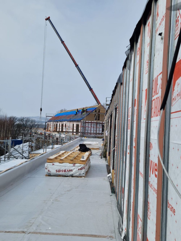 -zakończono montaż wiązarów dachowych, rozpoczęto wykonywanie łacenia dachu oraz wykonywanie wiatroizolacji,
